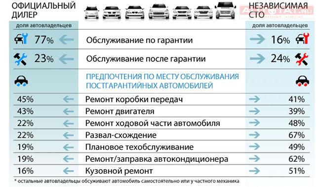 Отметим, что после гарантийного срока картина резко меняется: к официальным дилерам автовладельцы обращаться начинают реже (23%), а популярность независимых СТО наоборот возрастает (24%).