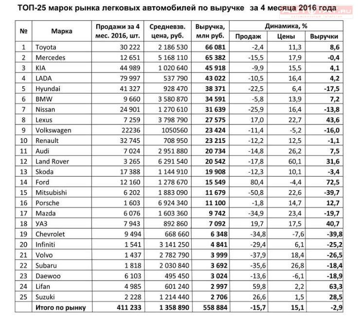 ТОП-25 марок автомобильных брендов по выручке за 4 месяца 2016 года